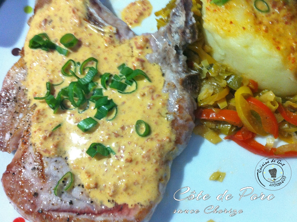 Côte de Porc sauce chorizo, fondue de légumes et purée