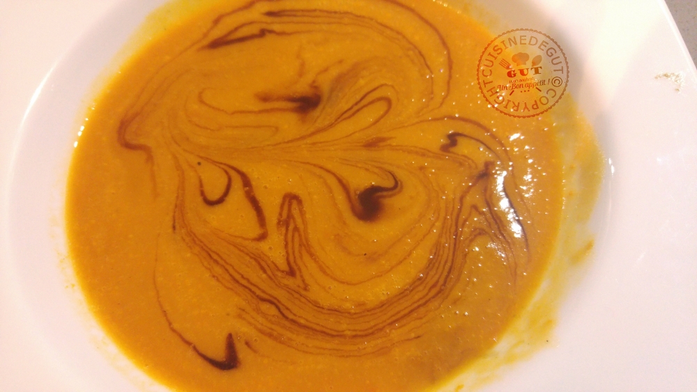 Potage de poivrons et patates douces saveurs de coriandre, raz el hanout et crème balsamique