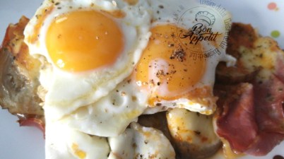 Oeuf au plat sur aubergine mozza et bacon