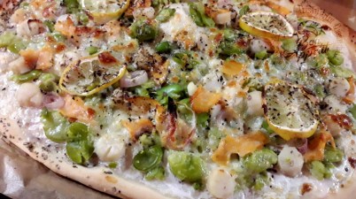 Pizza aux fèves noix de pétoncle et truite fumée