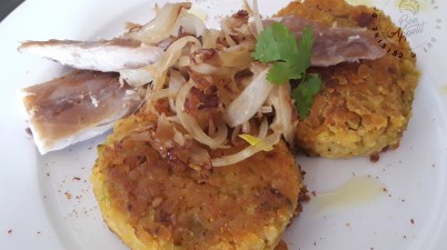 Galettes de lentilles corail poireaux oignons caramélisés et maquereau fumé