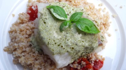 Cabillaud vapeur sauce pesto boulgour et tomates confites